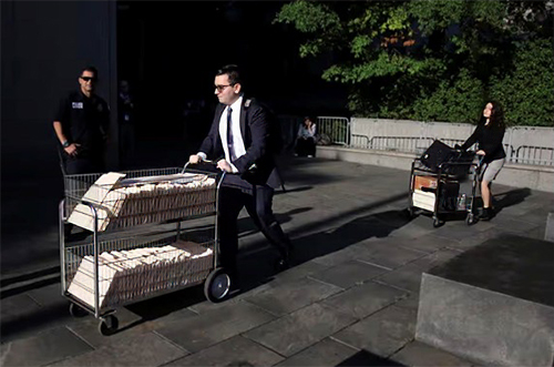 The image shows a lawyer wheeling files into a courthouse for the fraud trial of Sam Bankman-Fried, founder of the FTX cryptocurrency exchange. Bankman-Fried was found guilty on 2 November 2023.